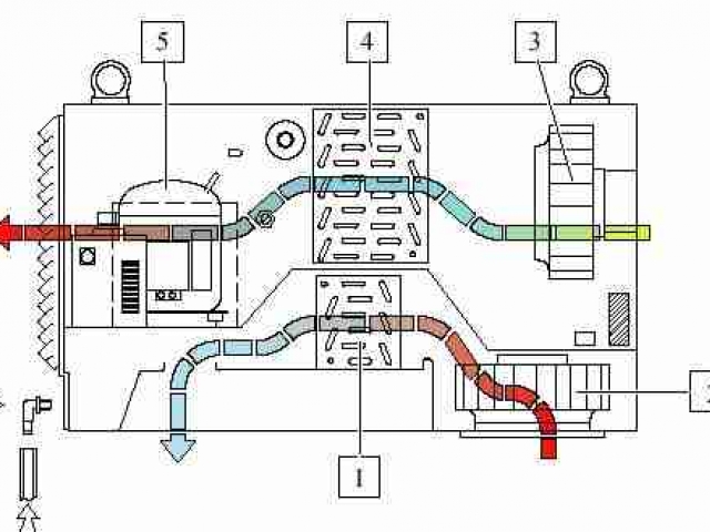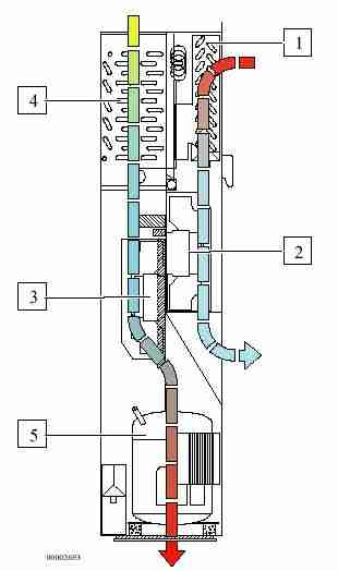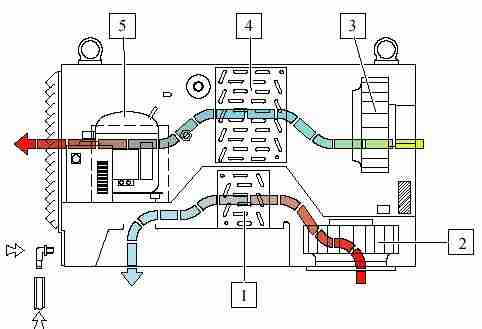 When the temperature rises in the electrical cabinet, the a/c unit cools the air in the lower envelope by means of the cooling circuit. The fan on the inner air circuit distributes the cold air.