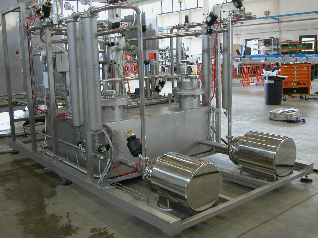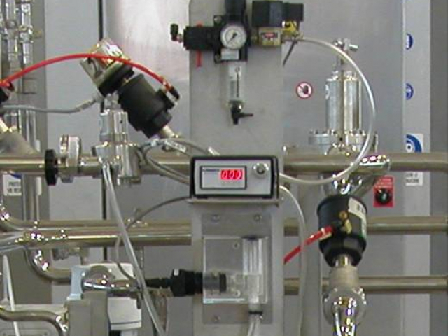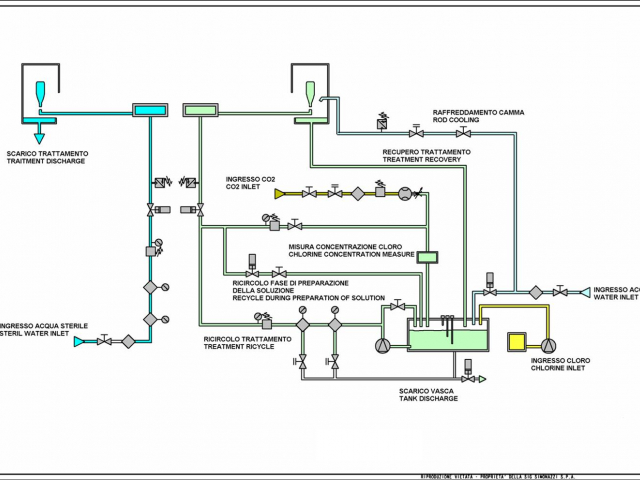 Automatic recirculated chlorine fed solution with subsequent rinse with non-recycled sterile water Purpose Recirculating system for container cleaning and disinfecting system using liquid containing a programmable concentration of chlorine. All components in contact with the product are in stainless steel AISI 316 L; all seals and instrumentation are made in PTFE or other material suitable for food product contact. Components * Rinsing solution infeed line fitted with a filter cartridge and a pneumatic interception valve * Preparation and chlorine solution recirculation tank, with the components (level sensor, return pump, automatic drainage) * Dynamic rinse water and reagent mixing system * 1.5 and 0.5 micron filtration system for the rinser input solution * Sodium hypochlorite system feed using electric membrane pump * Residual chlorine meter to check input ratio accuracy; * CO2 injection system. System fitted with automatic flow control.