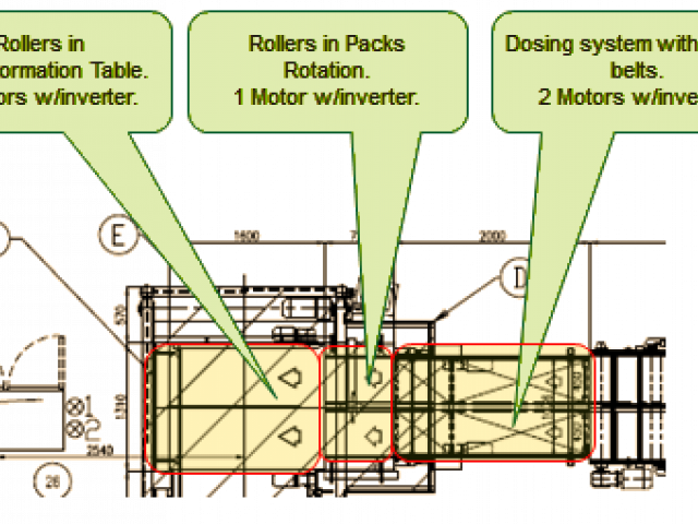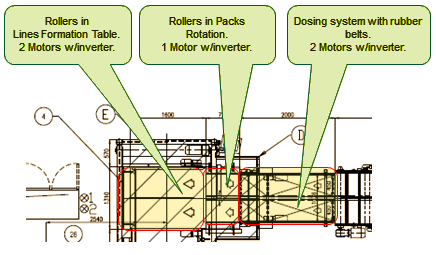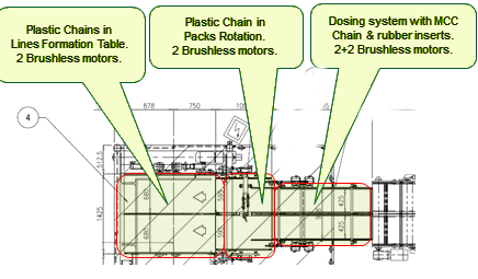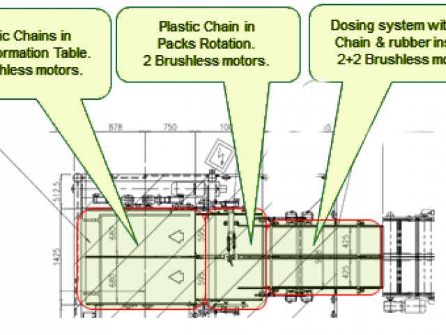The packs line formation and rotation is performed with plastic low friction chain and with electronic spacing principles - elimination of packs spacers, better packs control and speed optimization.