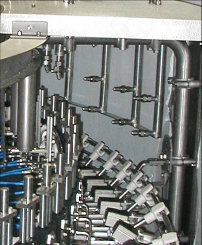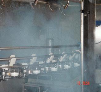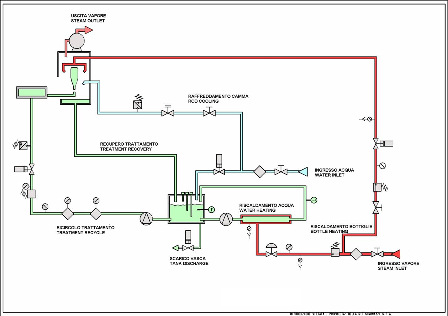 -Exterior bottle heating system max 45°C. Purpose Heating bottles externally using steam to heat and balance the temperature differential from the simultaneous internal heating. Process is recommended for situations where the container must reach a maximum of 45°C. Requires an annular manifold with nozzles and an electric aspirator as well as the steam infeed.