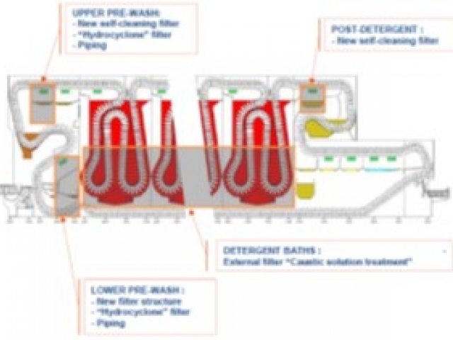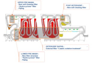 •Detergent filter designed for automatic filtration of the caustic soda solution in the detergent baths during production.