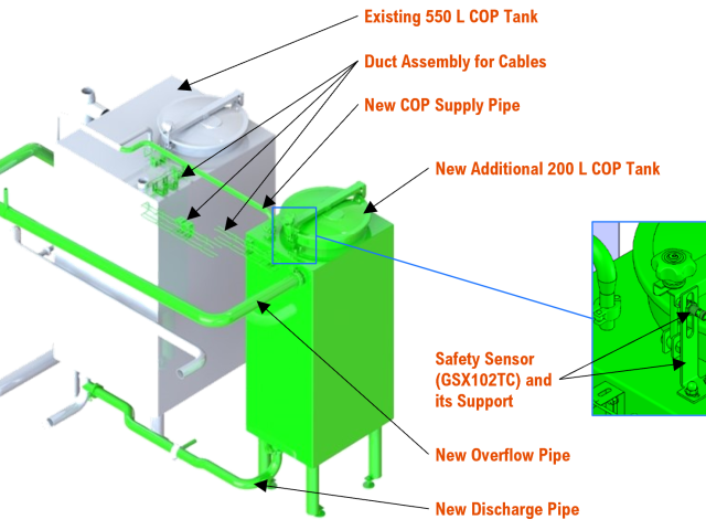 During the COP phase, the amount of sanitizer in the existing 550 liters tank could not be enough to clean the machine within an acceptable timeframe.