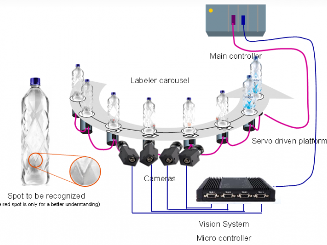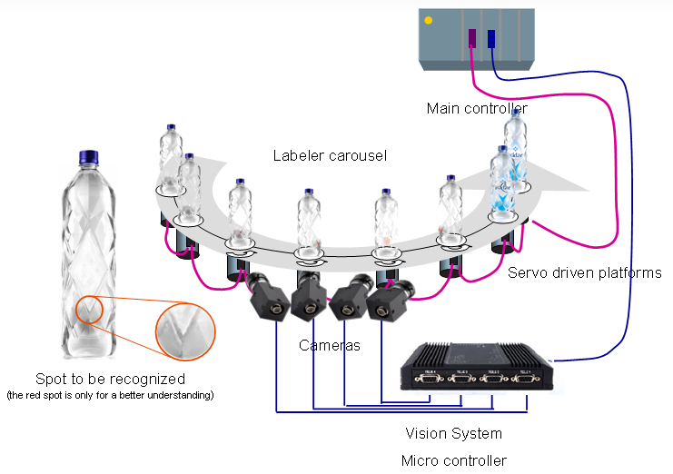 Sidel Video Orientation System is an automatic system with high speed cameras installed inside the labeler, at the carousel infeed. When entering into the labeler, the containers have a random orientation.