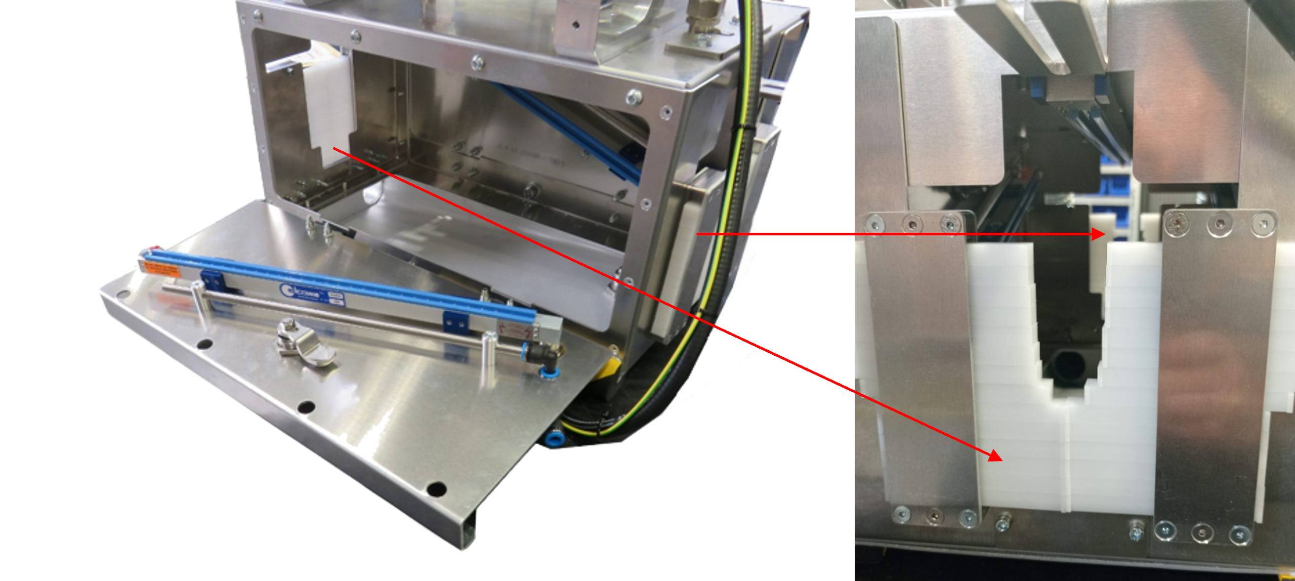 - Inséré sur le rail d'alimentation, cet équipement annule la charge d'électricité statique des particules et les élimine à l'aide d'un conduit d'aspiration