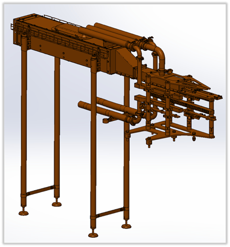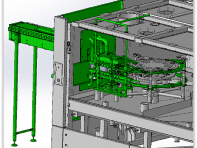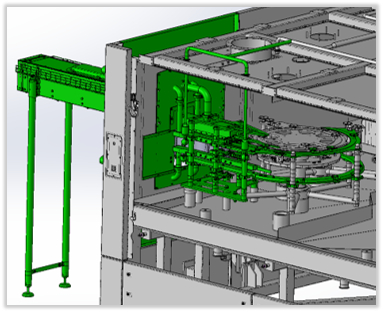 The tangential infeed, no longer descending and at the same height as the starwheels, allows the bottles to enter without crashing or being jammed/damaged