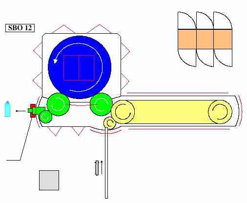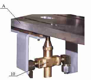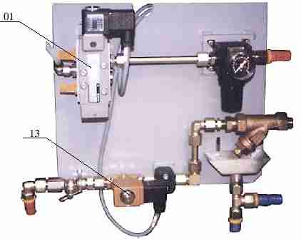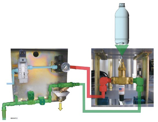 L'aria pressurizzata e l'acqua necessaria alla nebulizzazione dei fondi delle bottiglie provengono dai circuiti di regolazione aria e acqua. Quando il PLC autorizza la nebulizzazione (non appena viene autorizzato il cambio preforma), il distributore e l'elettrovalvola avviano la circolazione dei fluidi nei loro rispettivi circuiti. Il regolatore garantisce una pressione dell'aria di nebulizzazione a 1 bar (dal circuito 7 bar macchina). L'aria (1 bar) e l'acqua si mescolano in un kit "Spray Vector" e sono spruzzate sul fondo delle bottiglie attraverso l'apposito foro praticato nella piastra sul fondo. Il circuito di ritenzione permette di recuperare l'acqua di condensa e di evacuarla all'esterno della macchina attraverso un tubo.