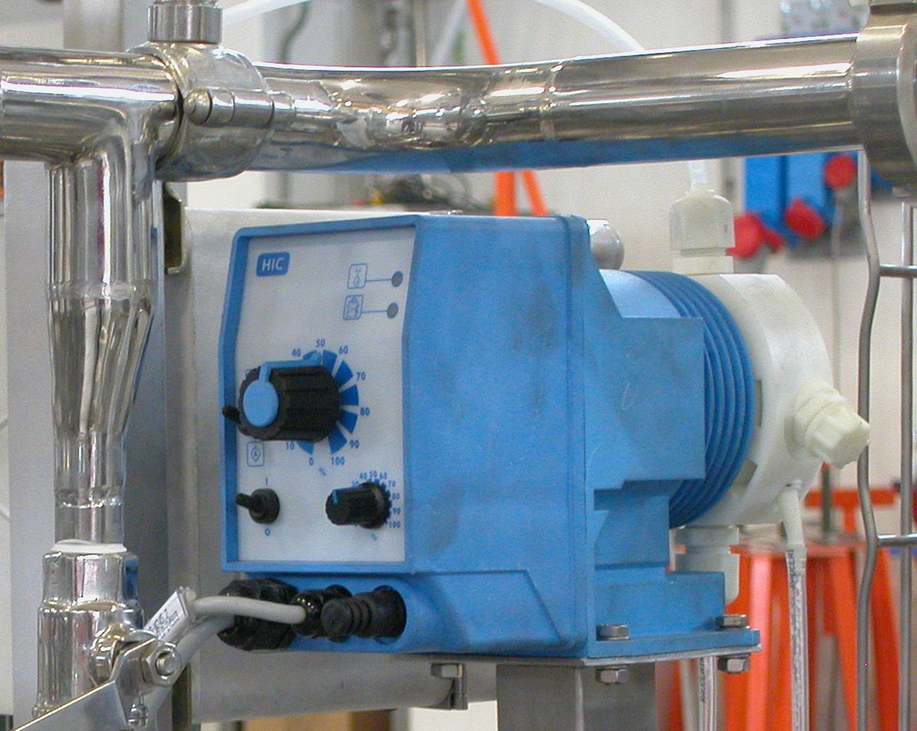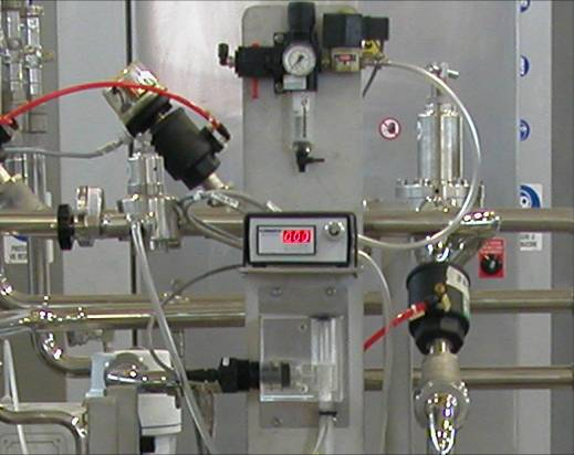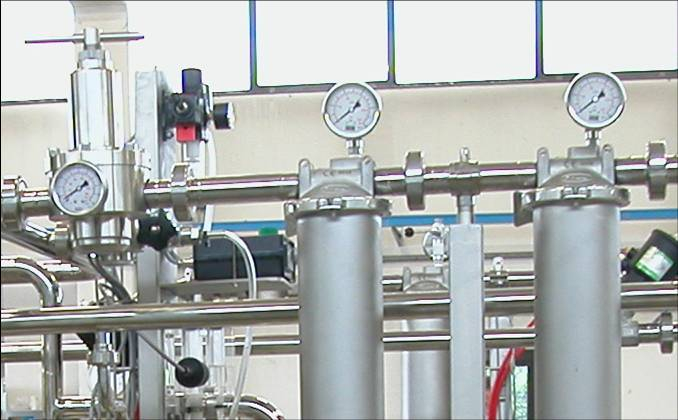 Dosaggio automatico di cloro con ricircolo della soluzione con successivo risciacquo in ricircolo con acqua sterile Scopo Sistema di ricircolo per il lavaggio e la disinfezione dei contenitori con liquido contenente una concentrazione programmabile di cloro. Tutti le parti a contatto con il prodotto sono realizzate in acciaio inox AISI 316 L; tutte le guarnizioni e le strumentazioni sono realizzate in PTFE o altro materiale idoneo al contatto con prodotti alimentari. Componenti * Linea di ingresso soluzione di risciacquo equipaggiata con un filtro a cartuccia e una valvola pneumatica di intercettazione * Vasca di preparazione e ricircolo della soluzione di cloro, con relativa componentistica (sensore di livello, pompa di rilancio, drenaggio automatico) * Sistema di miscelazione dinamica dell'acqua di risciacquo e dei reagenti * Sistema di filtrazione a 1,5 micron e 0,5 micron per la soluzione di invio alla sciacquatrice * Sistema di dosaggio dell'ipoclorito di sodio mediante pompa elettrica a membrana * Clororesiduometro per la verifica della correttezza del dosaggio * Sistema di iniezione di CO2 Sistema provvisto di controllo automatico della portata.
