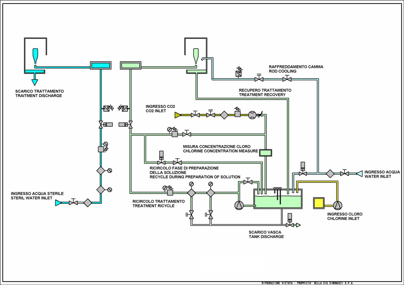 Dosaggio automatico di cloro con ricircolo della soluzione con successivo risciacquo con acqua sterile a perdere Scopo Sistema di ricircolo per il lavaggio e la disinfezione dei contenitori con liquido contenente una concentrazione programmabile di cloro. Tutti le parti a contatto con il prodotto sono realizzate in acciaio inox AISI 316 L; tutte le guarnizioni e le strumentazioni sono realizzate in PTFE o altro materiale idoneo al contatto con prodotti alimentari. Componenti * Linea di ingresso soluzione di risciacquo equipaggiata con un filtro a cartuccia e una valvola pneumatica di intercettazione * Vasca di preparazione e ricircolo della soluzione di cloro, con relativa componentistica (sensore di livello, pompa di rilancio, drenaggio automatico) * Sistema di miscelazione dinamica dell'acqua di risciacquo e dei reagenti * Sistema di filtrazione a 1,5 micron e 0,5 micron per la soluzione di invio alla sciacquatrice * Sistema di dosaggio dell'ipoclorito di sodio mediante pompa elettrica a membrana * Clororesiduometro per la verifica della correttezza del dosaggio * Sistema di iniezione di CO2 Sistema provvisto di controllo automatico della portata.