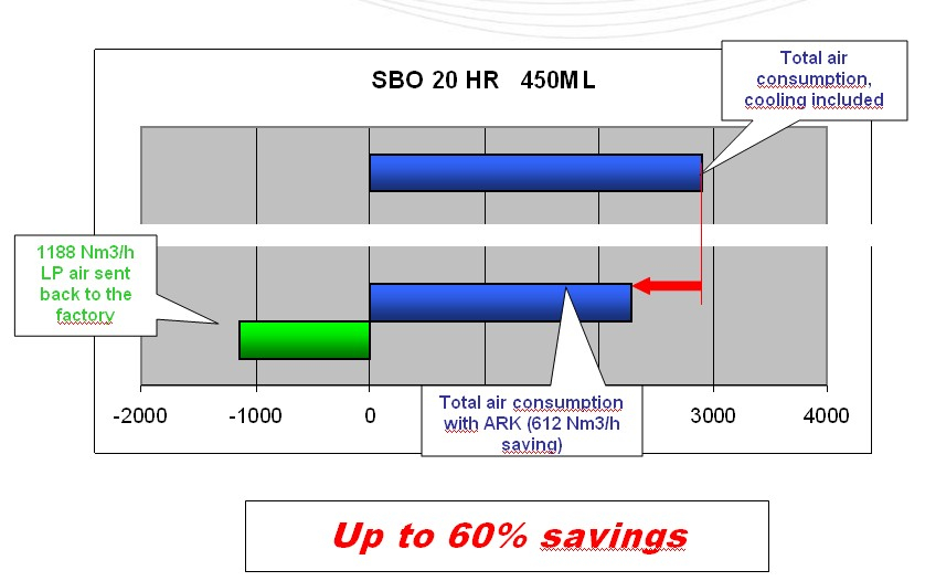 -Com a opção de recuperação de ar, se coleta mais de metade do ar usado que será convertido em ar de pré-sopro e ar de serviço, usado para produzir ar para a fábrica