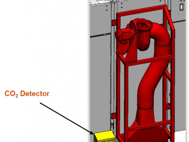 -The new system basically includes two components: CO2 extraction group and CO2 detector (in two points of detection). In order to extract the CO2 from the filler more effectively, it is foreseen to contain it with plastic guards: these will separate the filler from the space outside the protection doors, in the area shown in the figure below in yellow (at floor level).